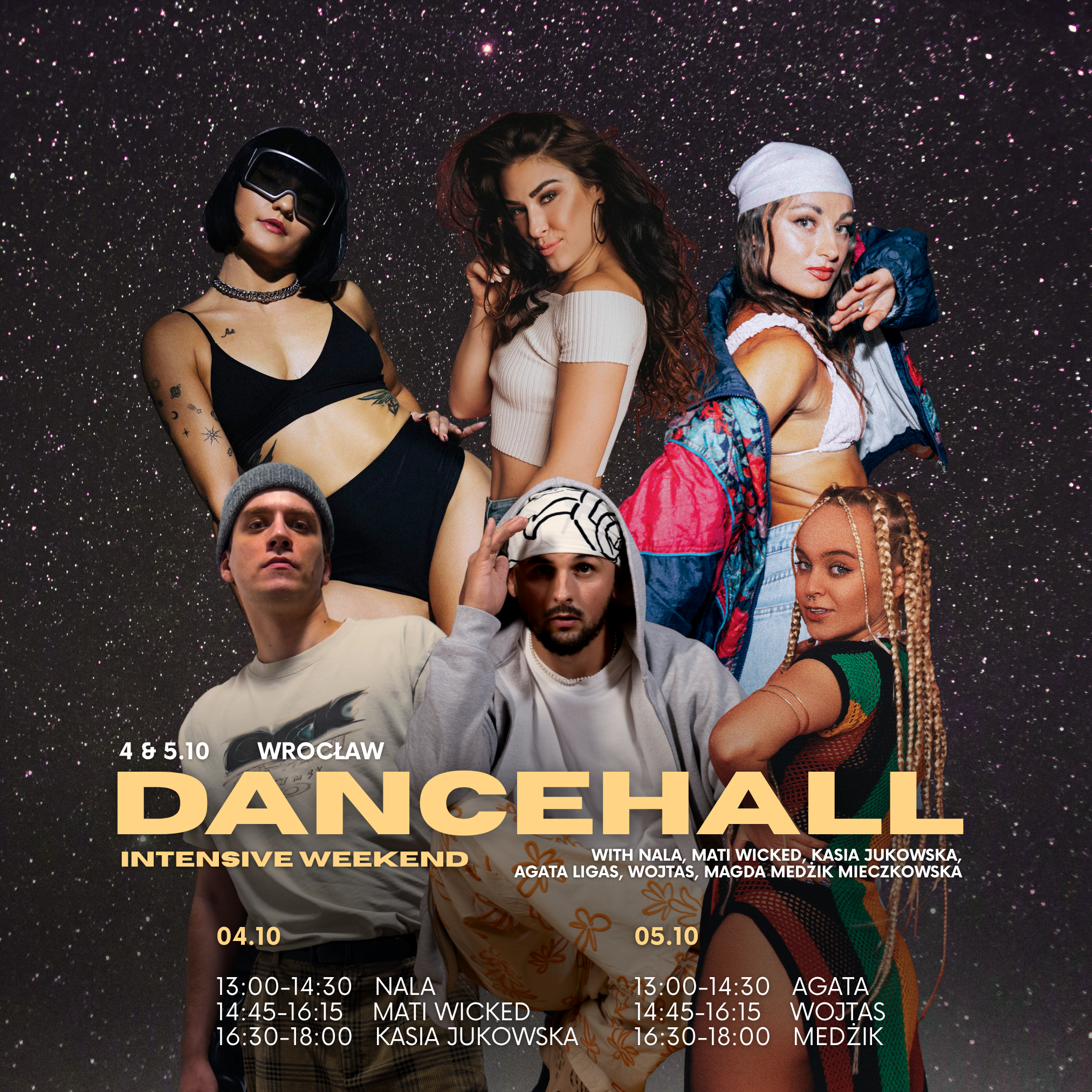 Dancehall Intensive to dwudniowy program dla tancerzy, którzy chcą pogłębić wiedzę i warsztat w dancehallu. Najlepsi instruktorzy w Polsce poprowadzą Cię przez pracę nad groove’em, techniką, feelingiem i różnorodnymi choreografiami – każdy w swoim unikalnym stylu.